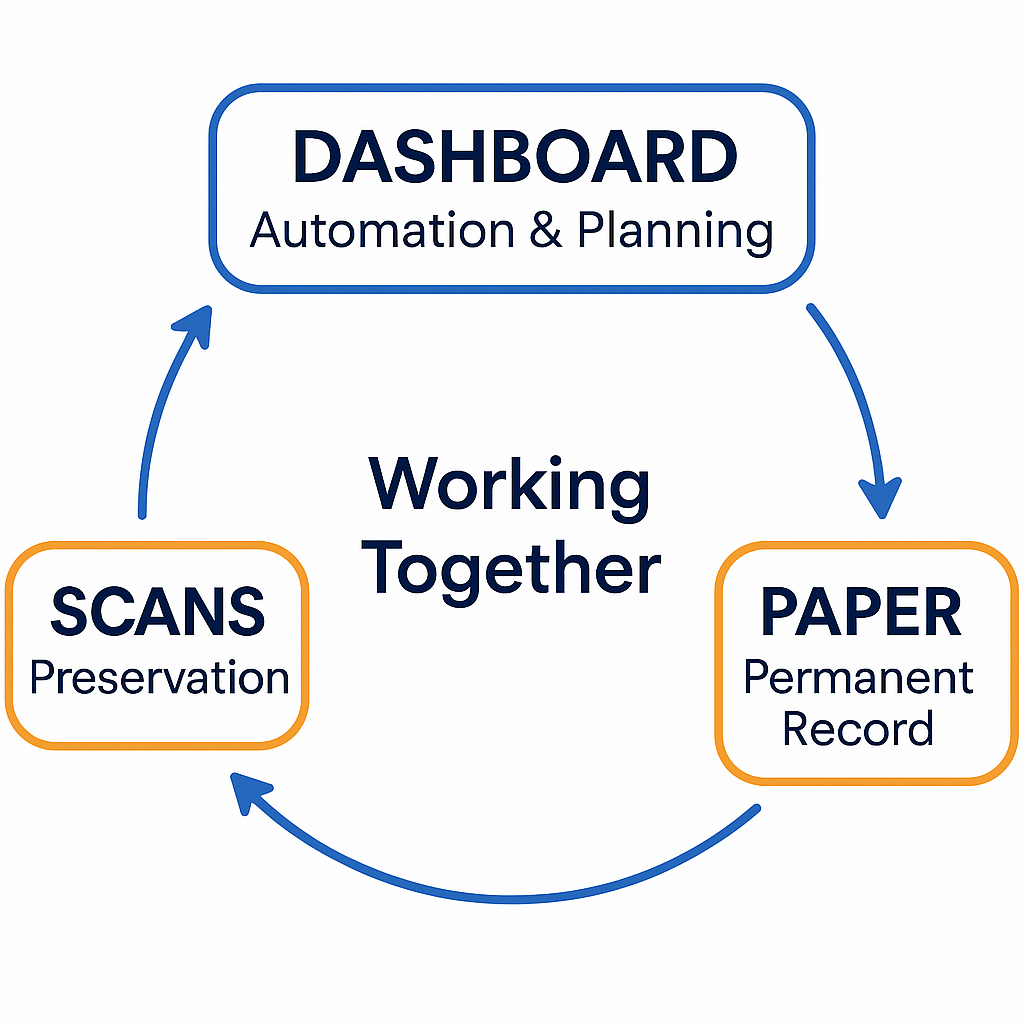 | Best Tool for Each Job | Paper = permanent record; scans = preservation; dashboard = automation and planning. | A balanced system that stays simple while leveraging the strengths of each layer. |