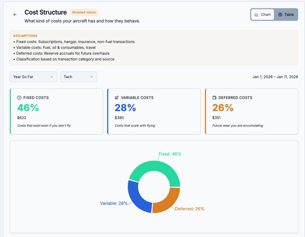 Cost Structure breaks ownership costs into meaningful categories, typically separating fixed commitments from variable, activity-driven expenses. This makes it easier to understand which costs scale with flying more, and which exist simply because the airplane exists.