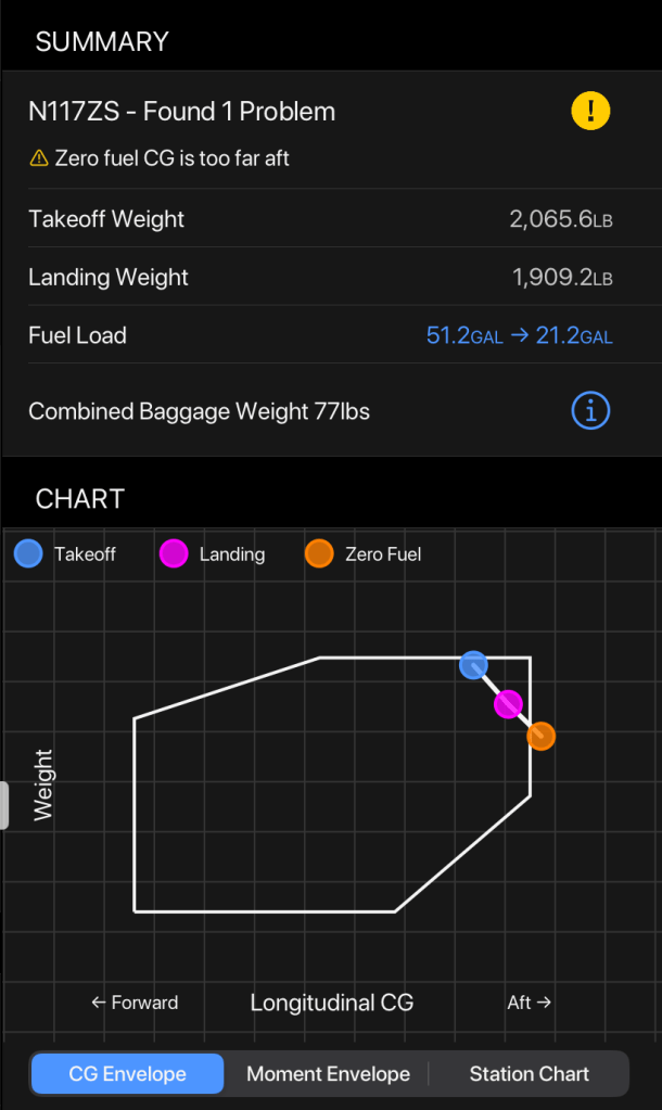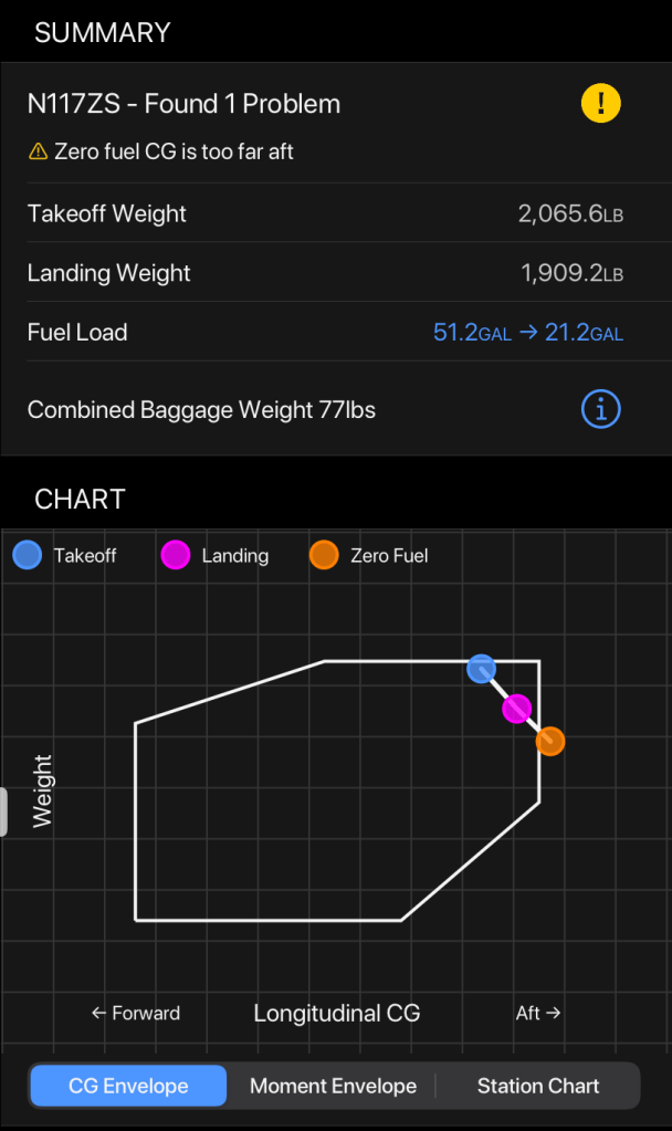Most importantly, these results show that the aft CG discussion is not about a single “bad” configuration. It is about how CG migrates over the course of a flight, and how fuel acts as a meaningful forward counterbalance. Garmin Pilot makes this visible—but only if you evaluate more than a single snapshot.