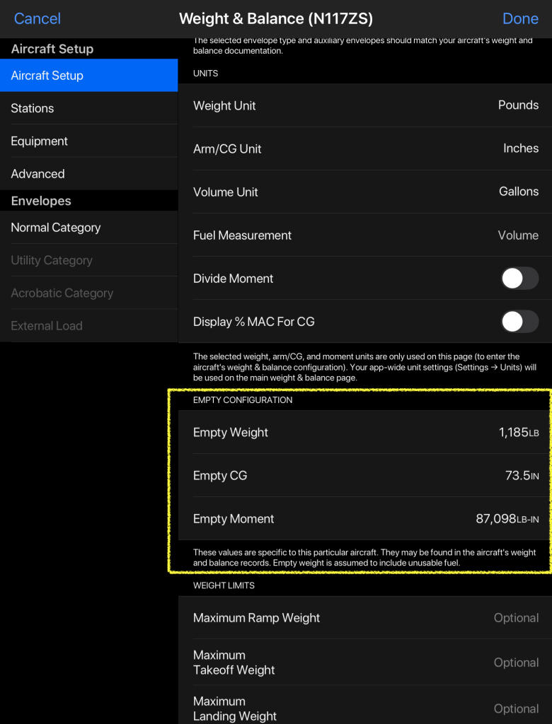 First, Garmin Pilot requires a complete aircraft profile before it will save anything. That means you need to be ready to enter all required data—envelope limits, stations, and aircraft details—in one pass.