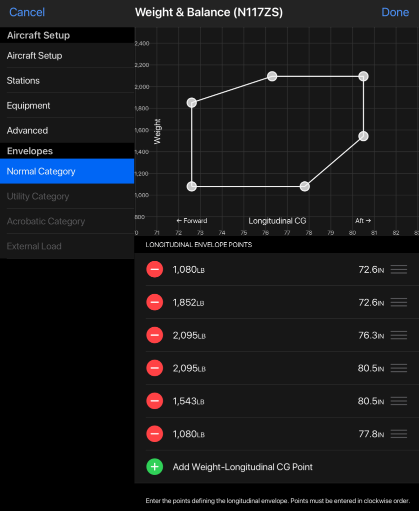 Garmin Pilot requires the CG envelope to be entered as a series of points, connected in order. These points must be entered clockwise, or Garmin Pilot will issue an error and will not accept the envelop definition. This is one of those details that isn’t obvious until you get it wrong.