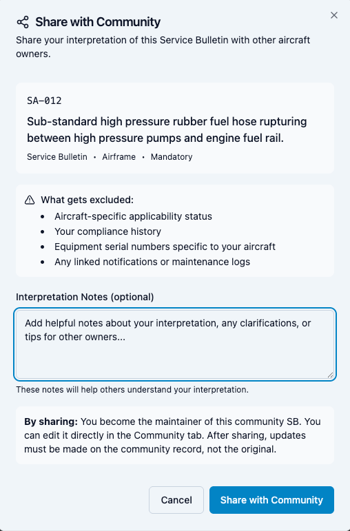 What gets shared is deliberately limited. A community SB contains no aircraft serial numbers, no compliance state, no dates, no signatures, and no maintenance actions. It is not a logbook entry. It is not a regulatory record. Think of it as a well-structured, community-reviewed starting point.