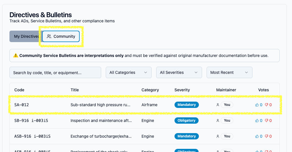 This feature also reflects a broader design philosophy behind SlingologyMX: provide structure where it helps, and stay out of the way where judgment is required. Experimental aviation has always relied on informed owners and an active community. Community Service Bulletins formalize that collaboration without trying to replace it.