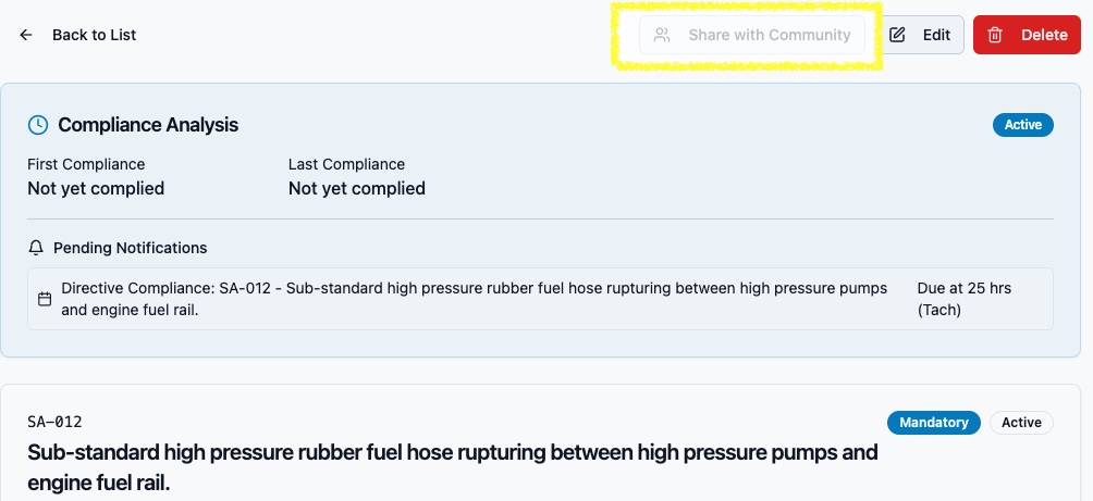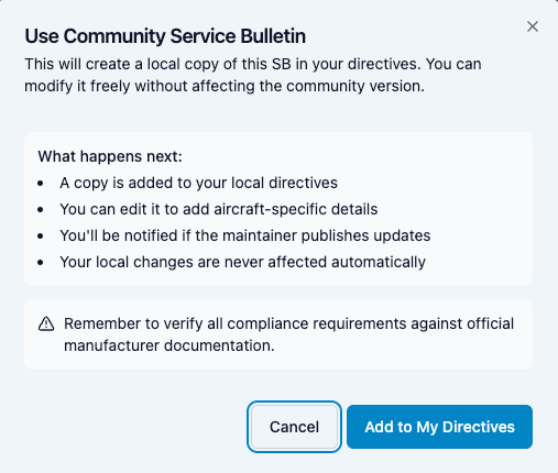 The moment a builder adopts a Community Service Bulletin, something subtle but crucial happens: the shared record becomes their Service Bulletin. From that point forward, it is owned, tracked, and managed independently inside that aircraft’s maintenance history. Compliance state, notes, decisions, and outcomes live with the airplane—not with the community record.
