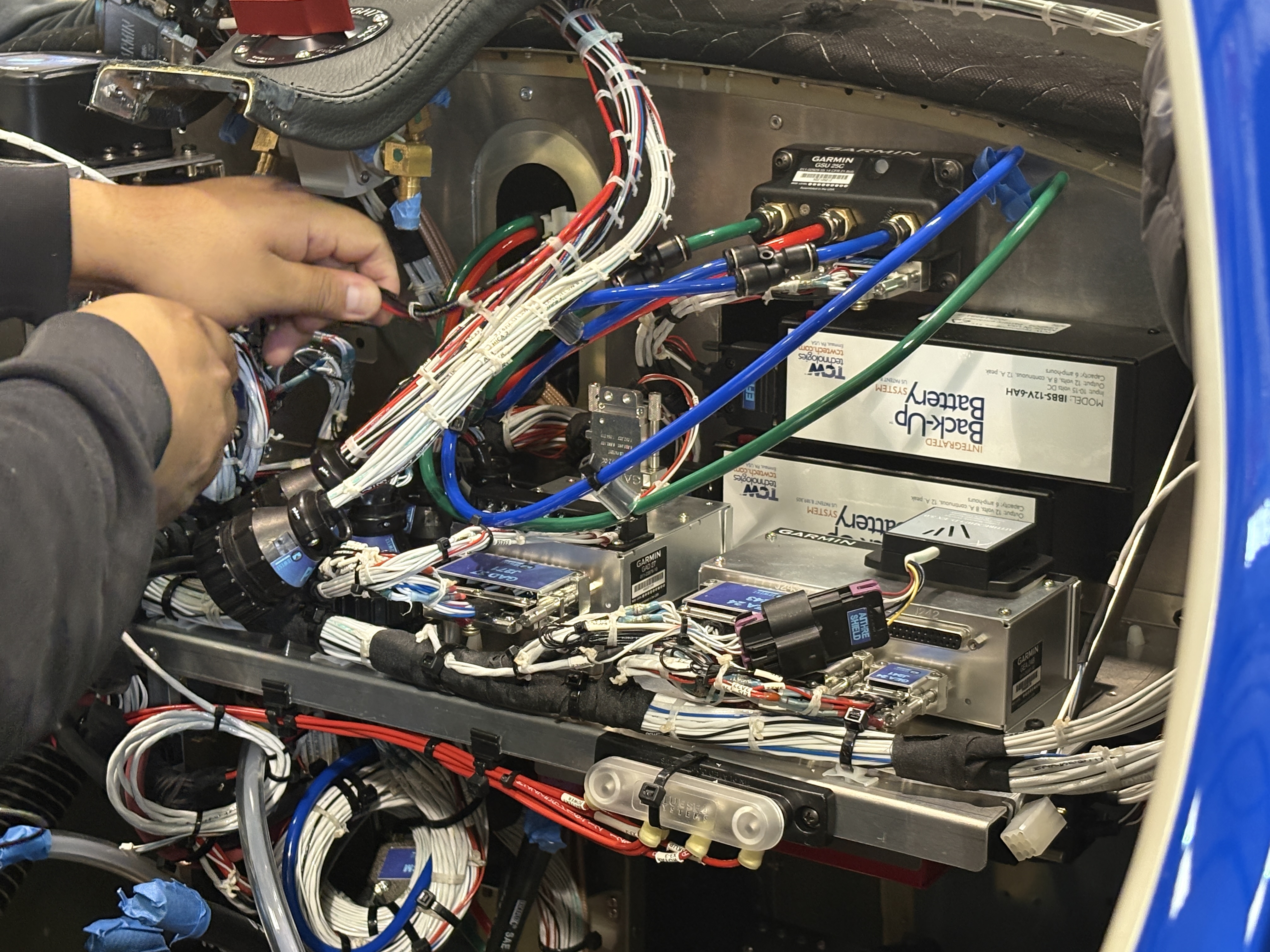 When I arrived, the avionics harness from Midwest Panels had already been installed — a task that took the team the better part of a week. That alone tells you how dense this stage is. Behind every clean panel face lives an intricate network of connectors, labeled bundles, and carefully routed wiring that has to work perfectly the first time.