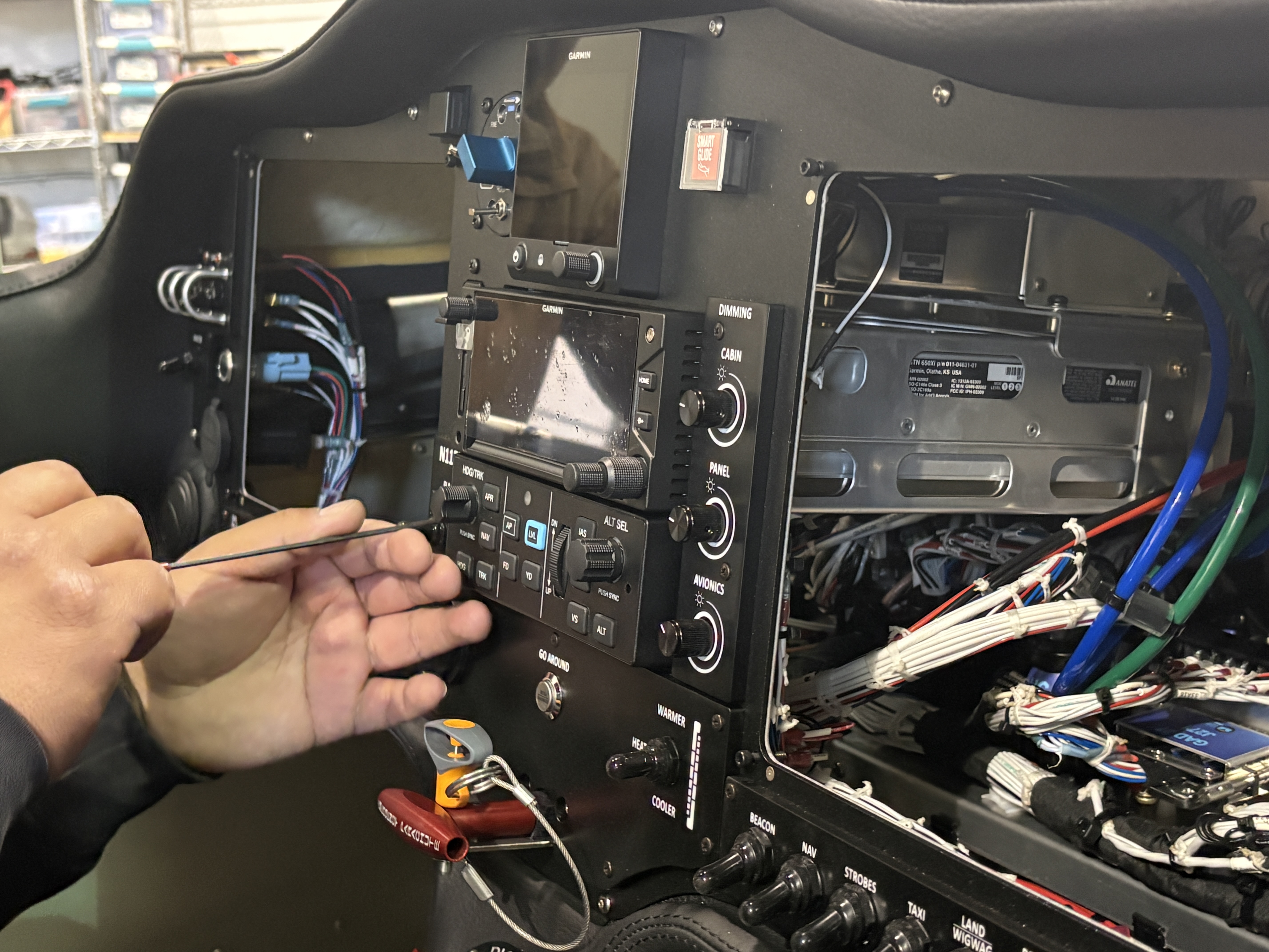 I walked in just as the front end of the panel was being installed. Screens slid into place. The GTN 650Xi was mounted. The GFC 507 controller settled into its position. It’s one thing to approve a panel layout on paper. It’s another to see it physically assembled in your airplane.