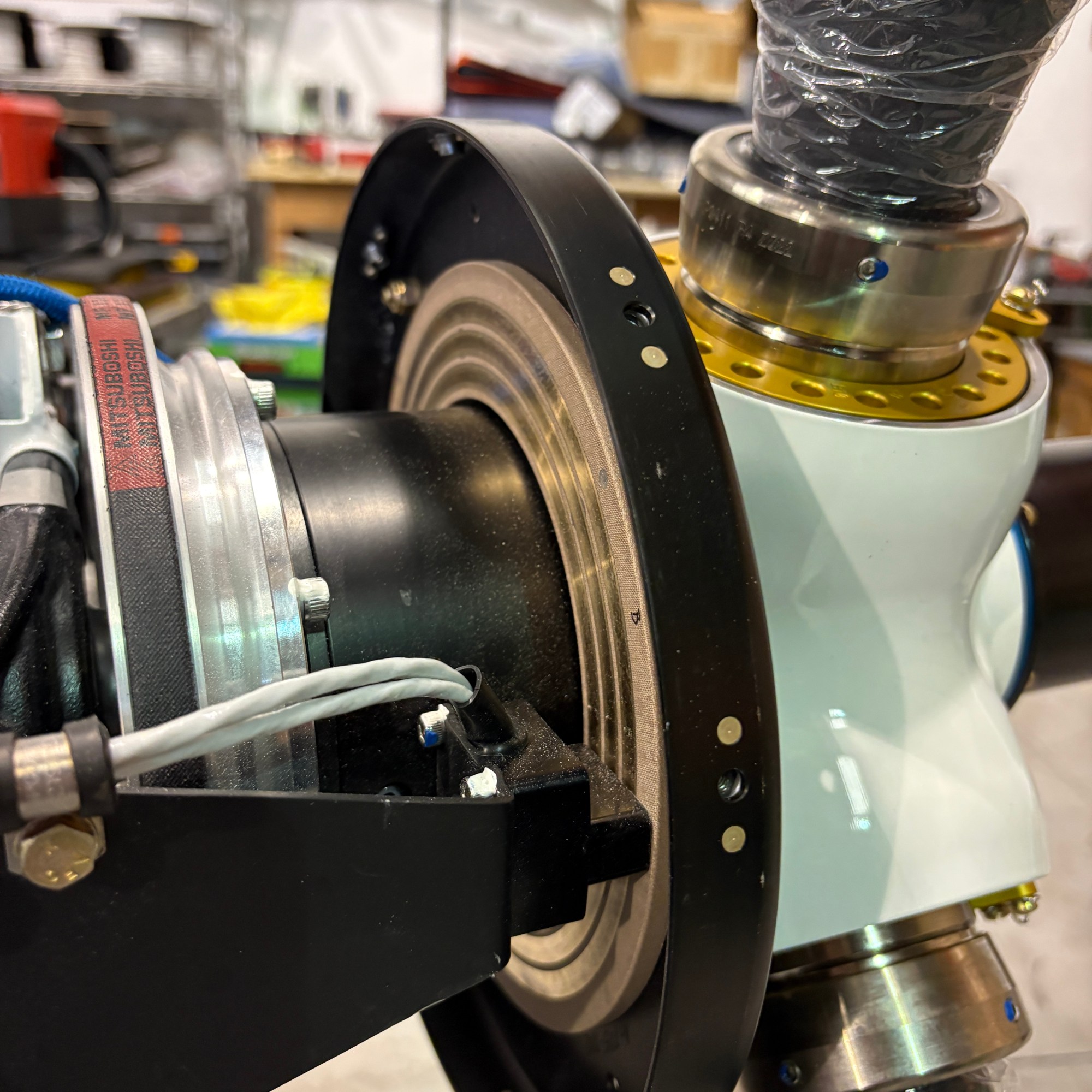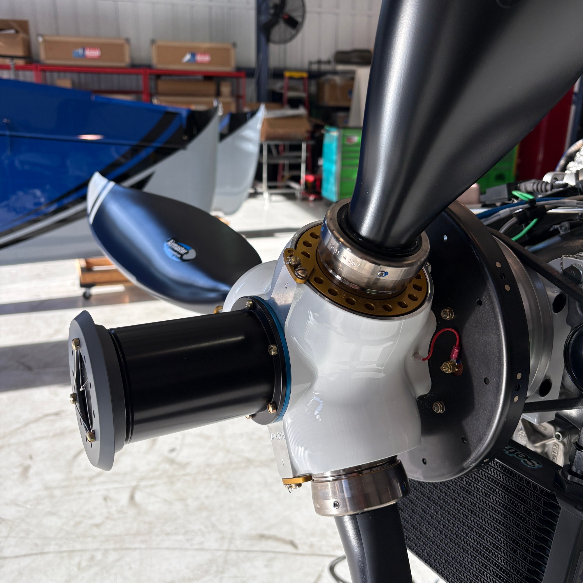 This was my first opportunity to really study the Airmaster Propellers hub and control system up close. On paper, an electrically controlled constant-speed propeller sounds almost abstract. In person, it’s beautifully mechanical. The compact motor integrated into the hub, the rotating slip-ring disc, the brush system transferring power and control signals — it’s an elegant interface between electricity and aerodynamics, all happening at the front of the airplane.