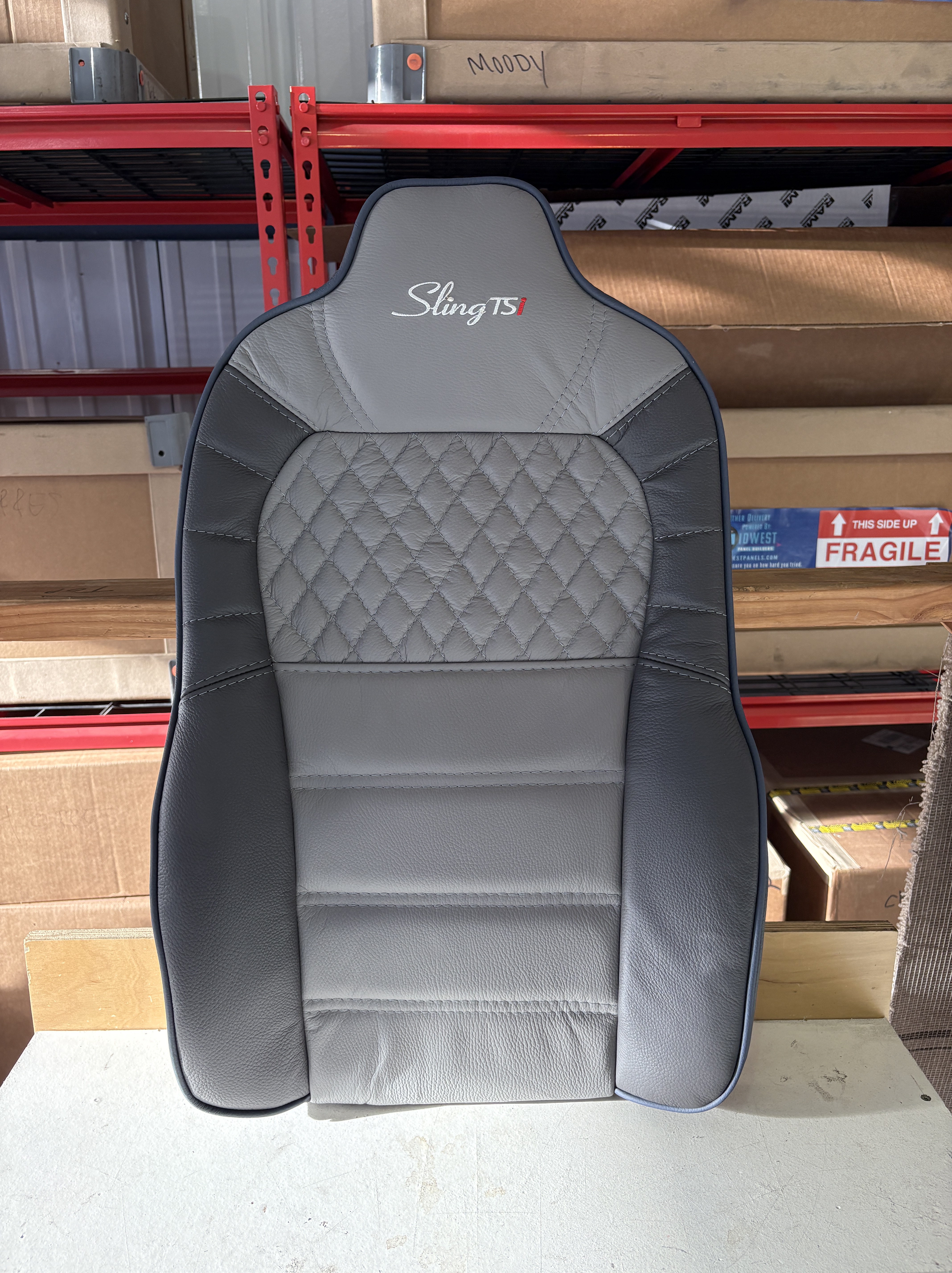 The seat upholstery was also in place. Grey with blue stitching — subtle, cohesive with the exterior scheme, and restrained in the same spirit as the paint design. Nothing loud. Just intentional choices coming together.
