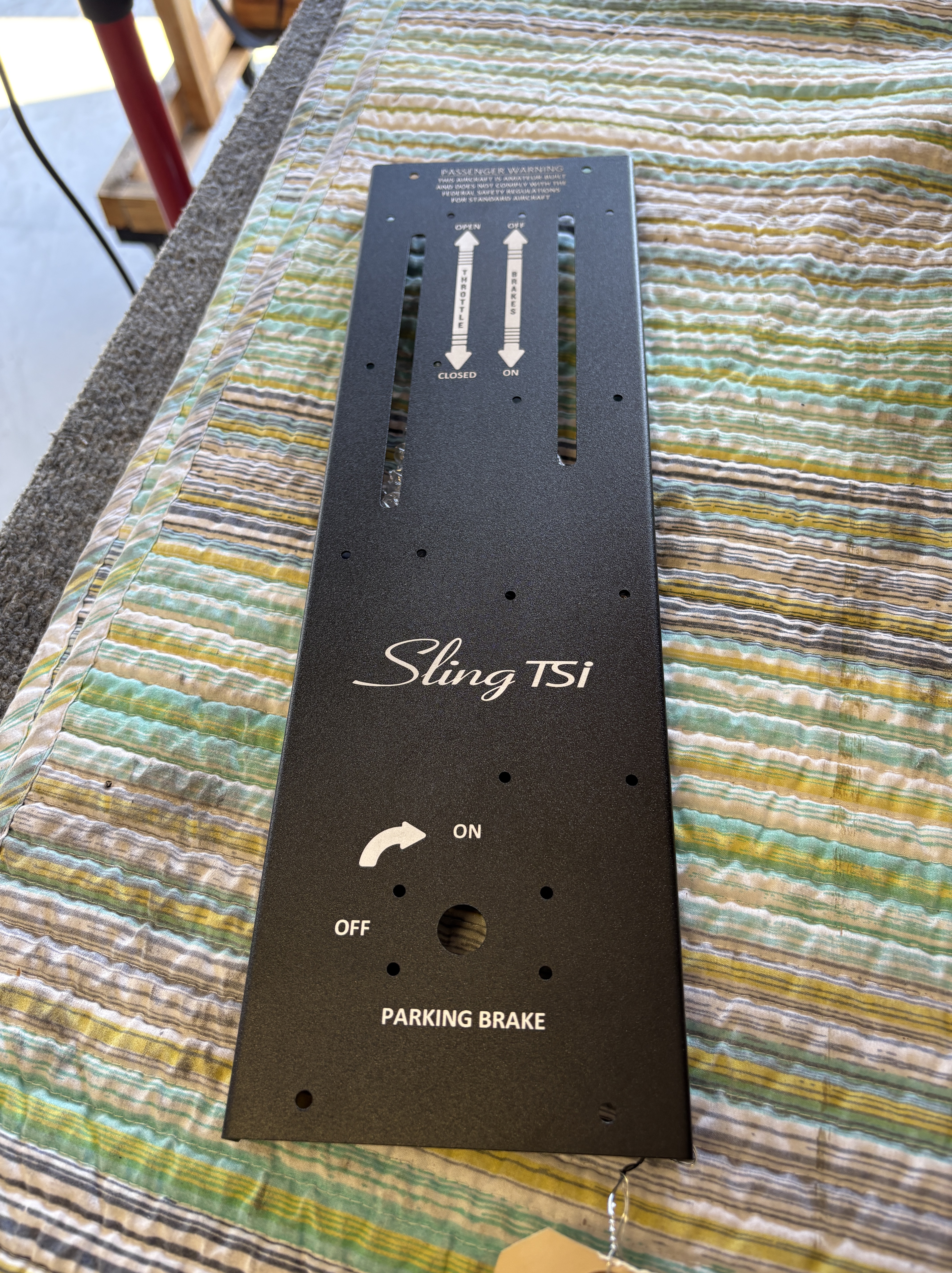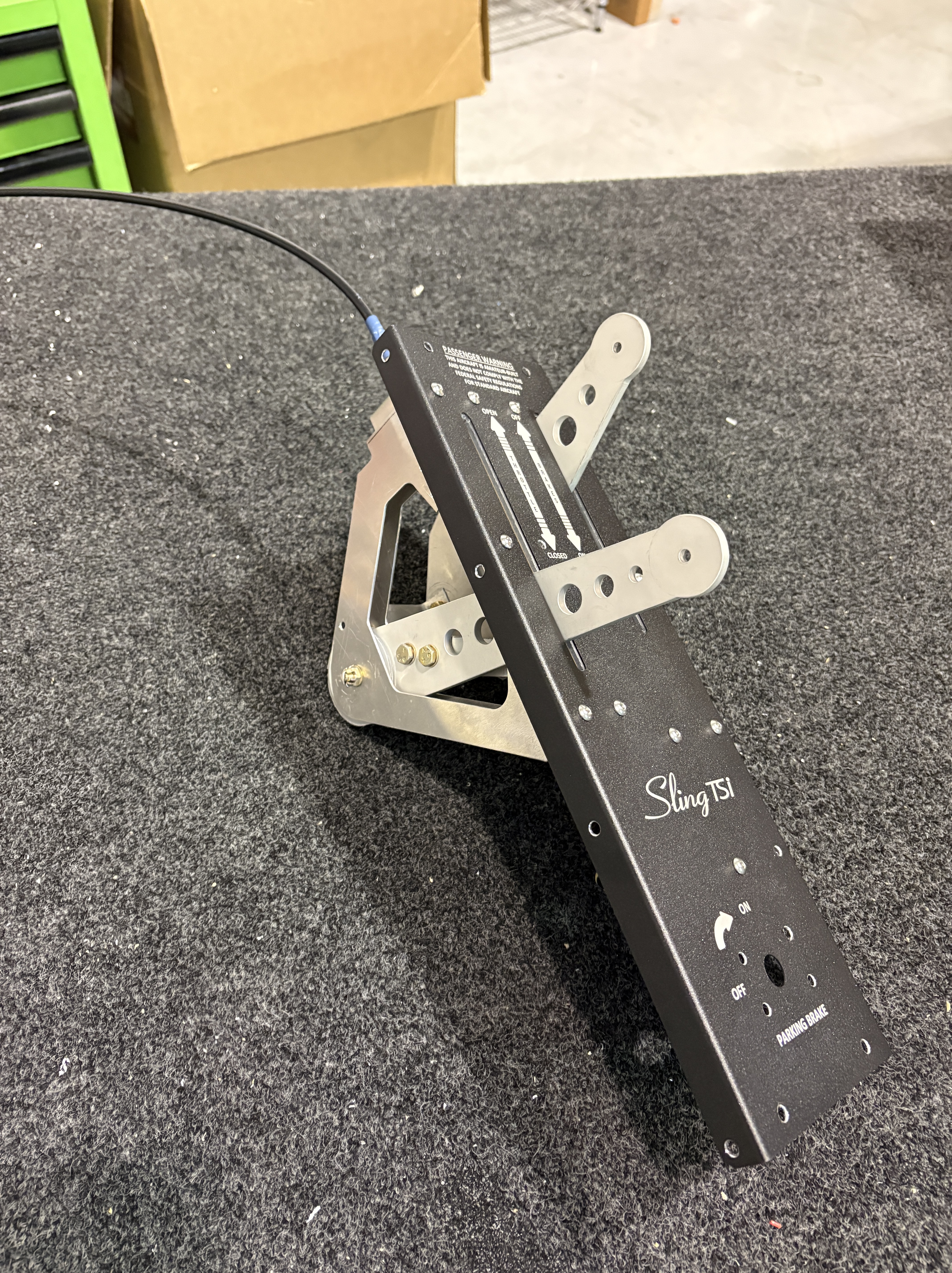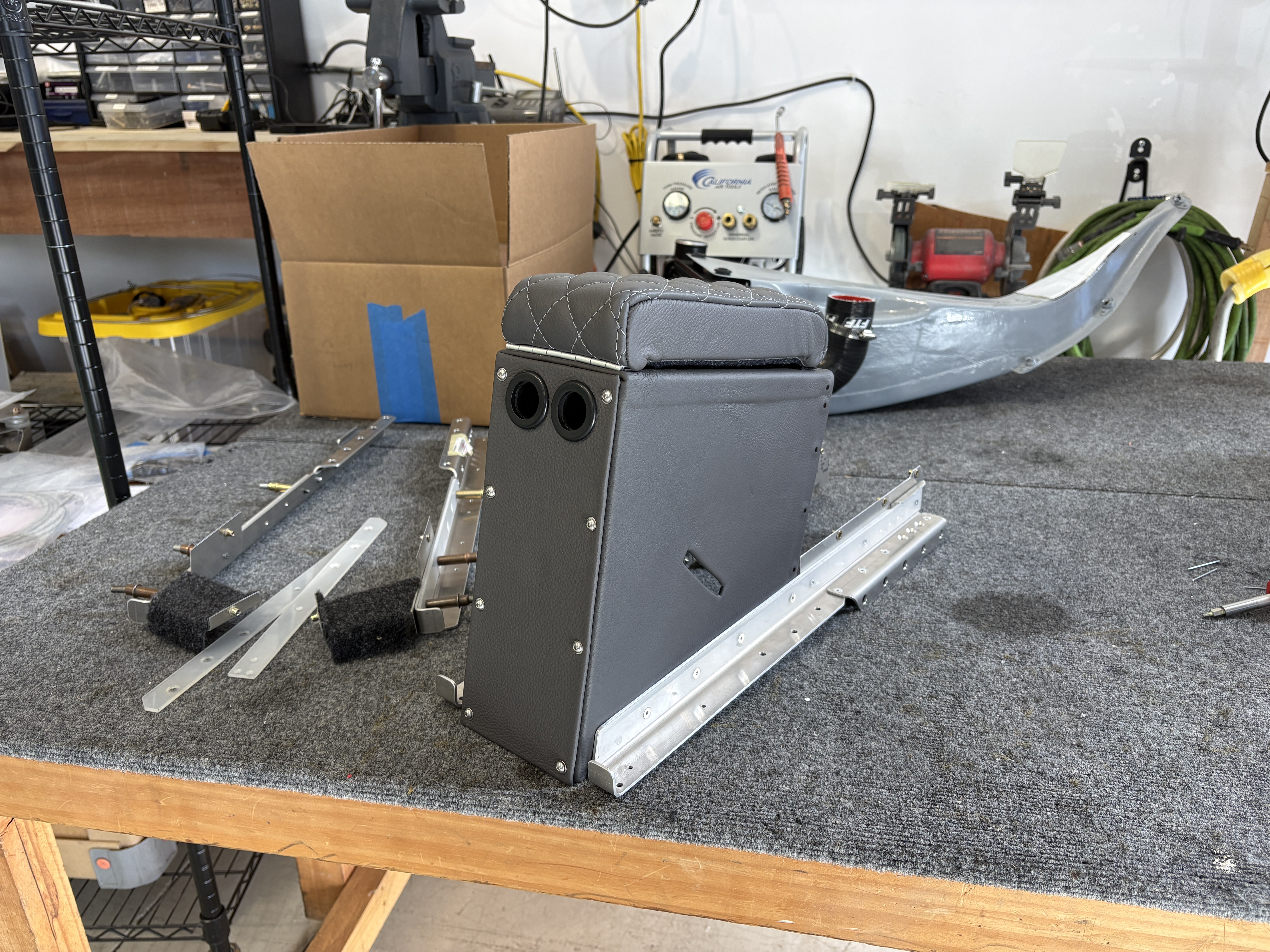 The console had just received the throttle and brake plate from Midwest Panels. The rudder motor sits beneath it, so everything had to align cleanly before installation. Once assembled, the console was installed in the fuselage, the throttle cable connected forward to the engine, and the brake linkage tied into the brake lines.