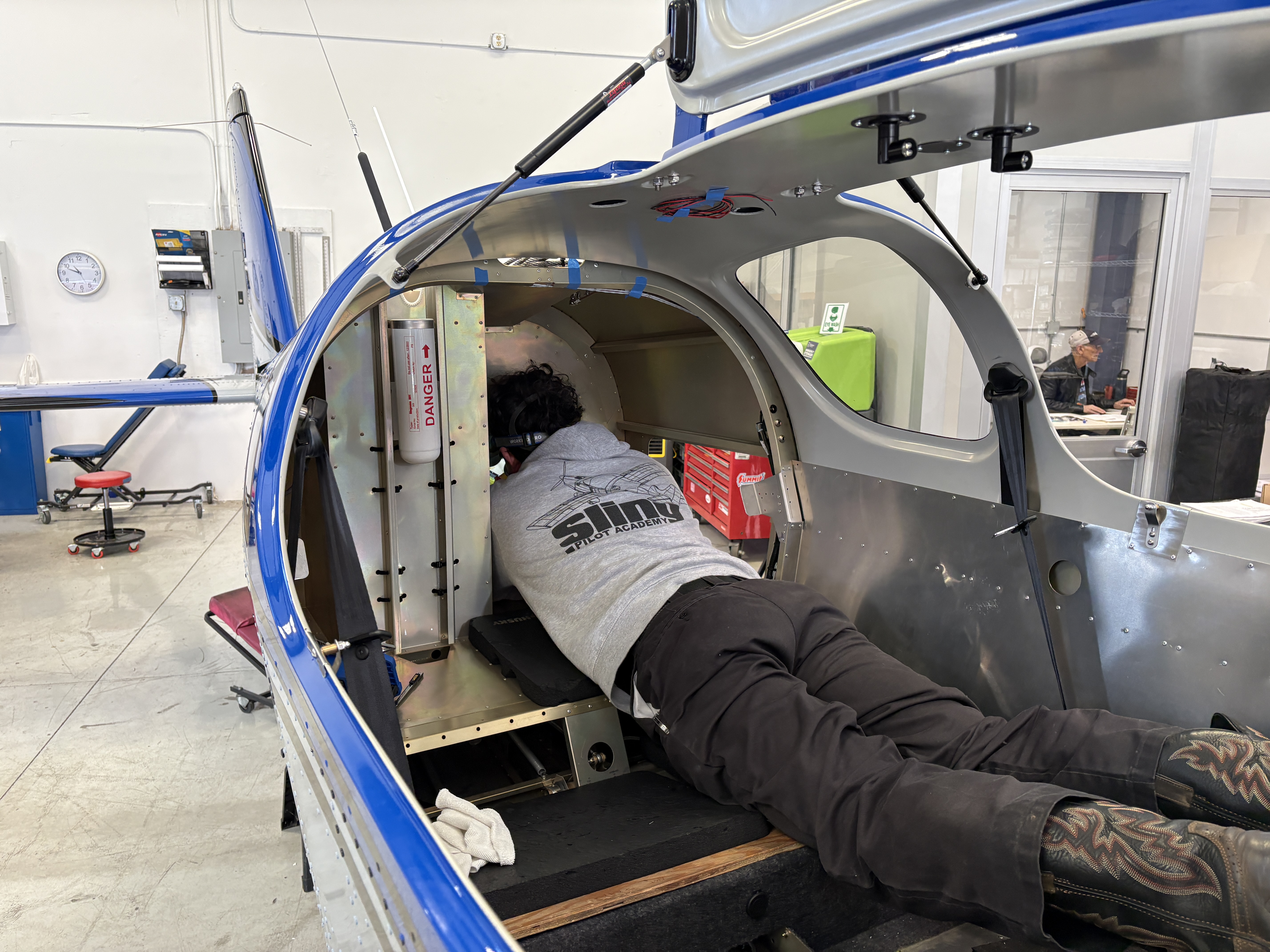 While much of the visible progress was happening on the outside — wings, propeller, panel — quieter work continued inside the fuselage.