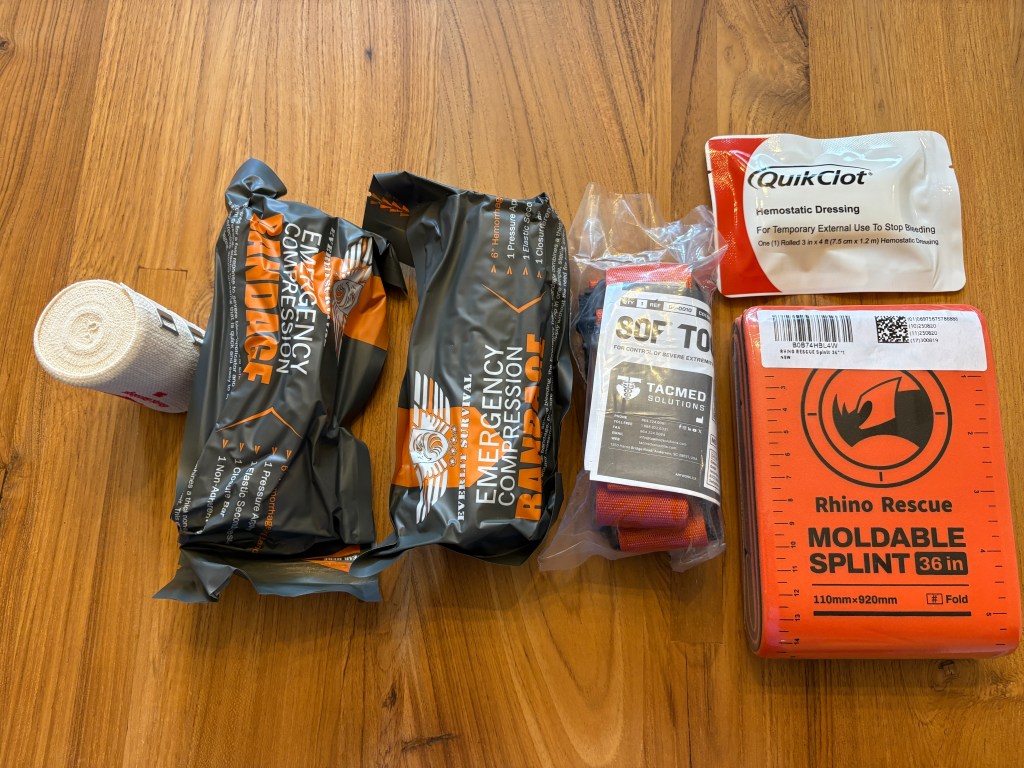 After an off-airport landing, the most immediate risk is not hunger or thirst—it is injury. Even a relatively controlled landing can result in cuts, blunt trauma, or fractures. For that reason, the most important category in the kit focuses on bleeding control and basic injury stabilization.