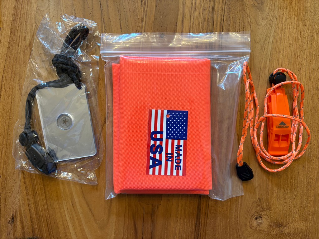 For this reason, the kit includes several simple signaling tools: a signal mirror, a high-visibility signal panel, and a safety whistle. These items are lightweight, inexpensive, and extremely compact, yet they can be very effective in attracting attention once rescuers are operating in the vicinity.