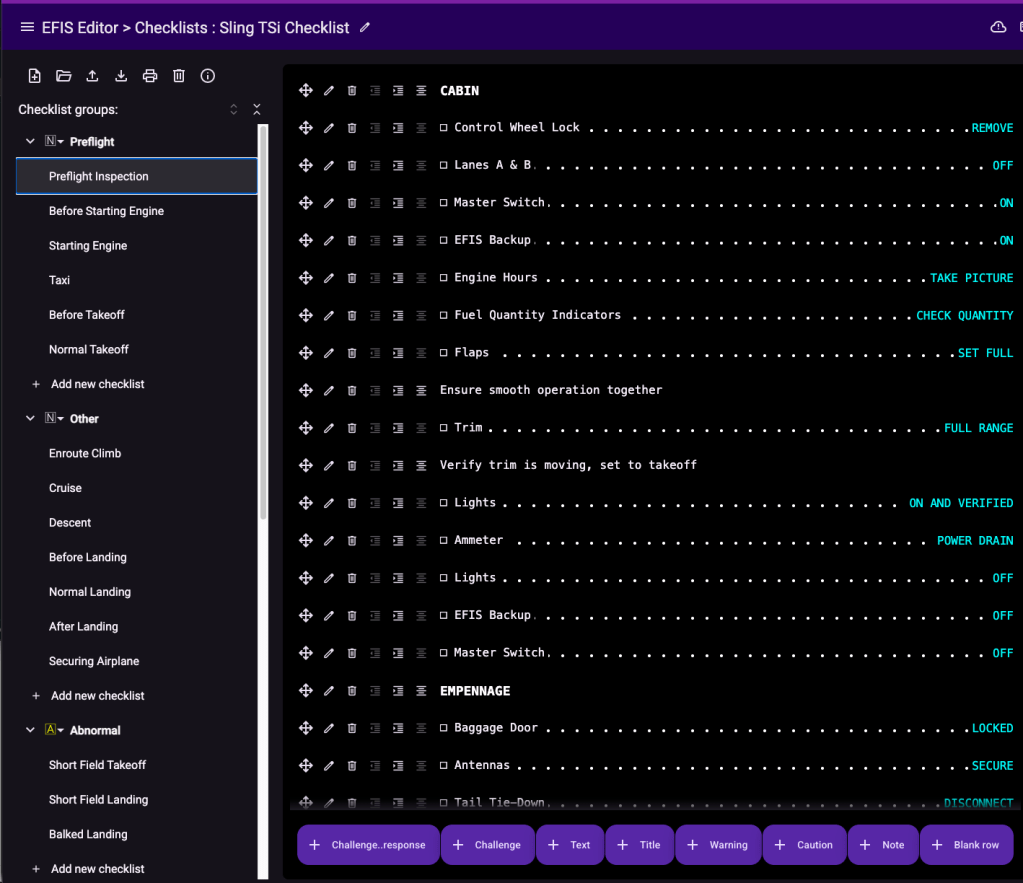 The one caveat worth being upfront about: if you’ve already built checklists in Garmin Pilot, you’ll need to re-enter them in EFIS Editor to get started. It’s a one-time investment — and given that you’re building them in an open, portable format this time, it’s the last time you’ll ever have to do it.
